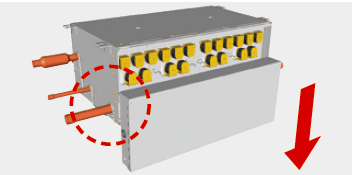 Der Wärmetauscher der Außeneinheit ist zweigeteilt und besteht aus einer oberen sowie einer unteren Komponente. Durch eine optimierte Kältemittelführung und-steuerung wird die Effizienz des Wärmetauschers gesteigert, indem das Kältemittel verstärkt durch den oberen Teil des Wärmetauschers gelenkt wird, wo mehr Luft angesaugt wird.
