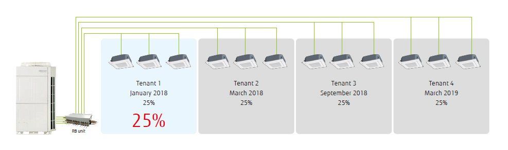 Diese Funktion ist besonders effektiv, wenn Gebäude bereits in der Bauphase teilklimatisiert wird. Die Installationsarbeiten können flexibel für jede Partei erfolgen.